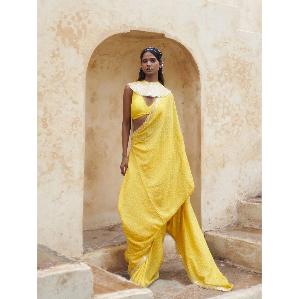 Yellow Bandani Saree with Unstitched Blouse and Collar
