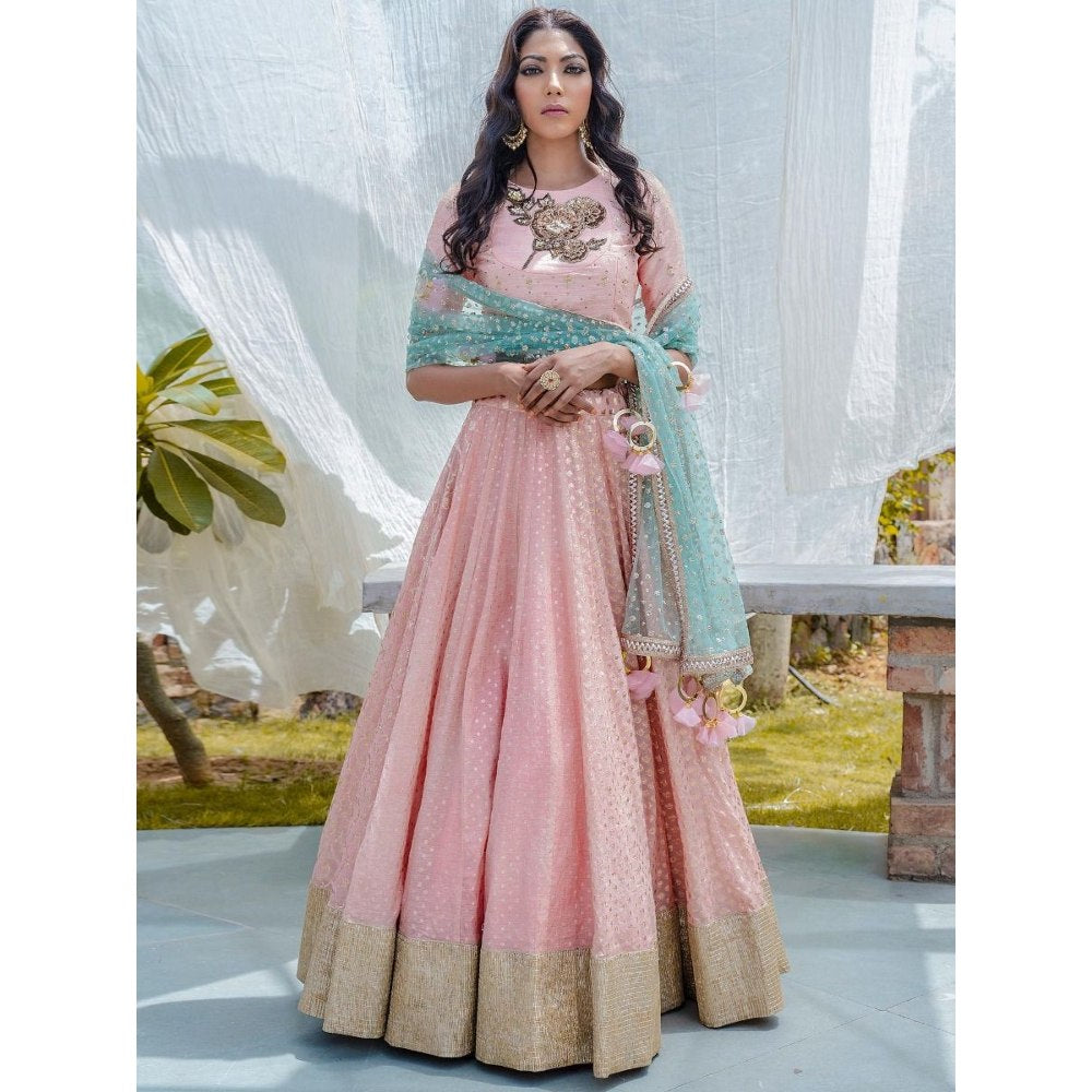 Description : This peach lehenga set by Rishi & Vibhuti is crafted in chanderi and comes with an ocean blue net dupatta accented with embellished details. The top features a round neck, half sleeves, a side zip fastening detail, a keyhole back, embellished details all over and a regular fit. The lehenga features a mid-rise waist, side dori tie-up details, embellished details all over, a golden zari border detail at the hemline and a comfortable fit. Buy this lehenga set online and style it with a pair of embellished heels and statement accessories to complete the look.