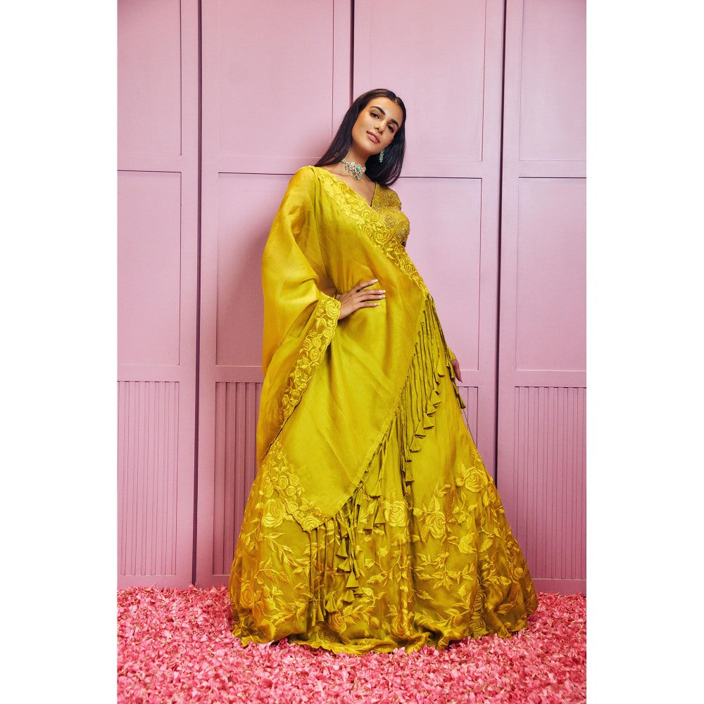 Description : Yellow-Green silk organza floral embellished lehenga set