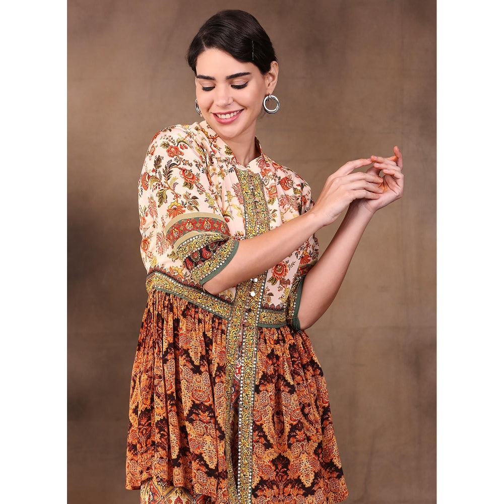 Description : Printed peplum top with embroidery highlights paired with printed pants