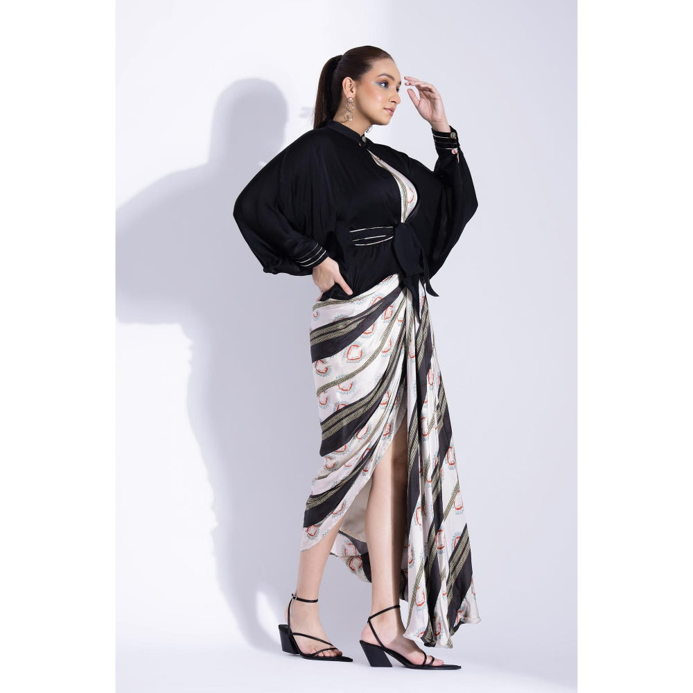 Studio Surbhi Navy Blue Printed Maxi Dress with Kimono Shirt and Belt (Set of 3)