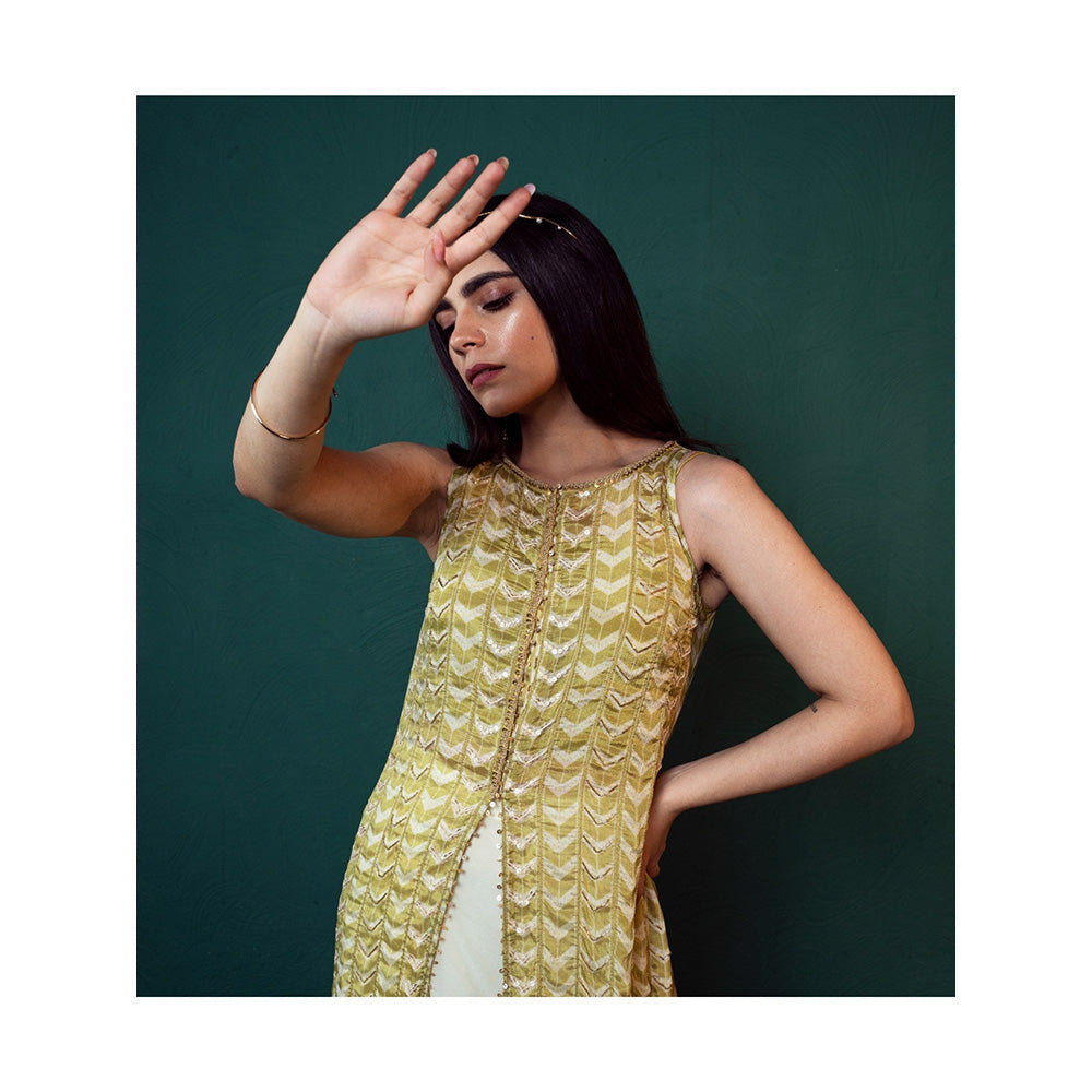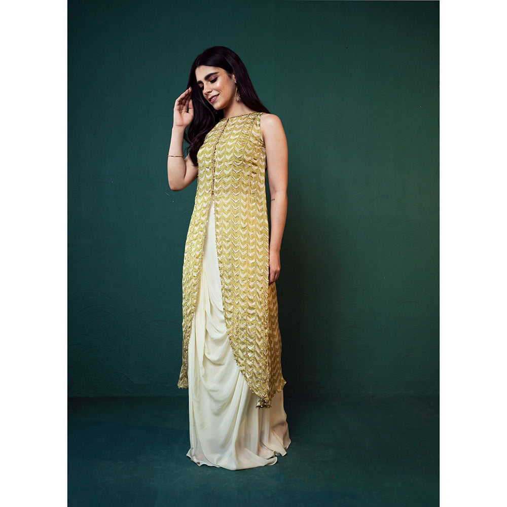 Description : A Contemporary Hand Embellished Kurta Paired With Signature Drape Skirt