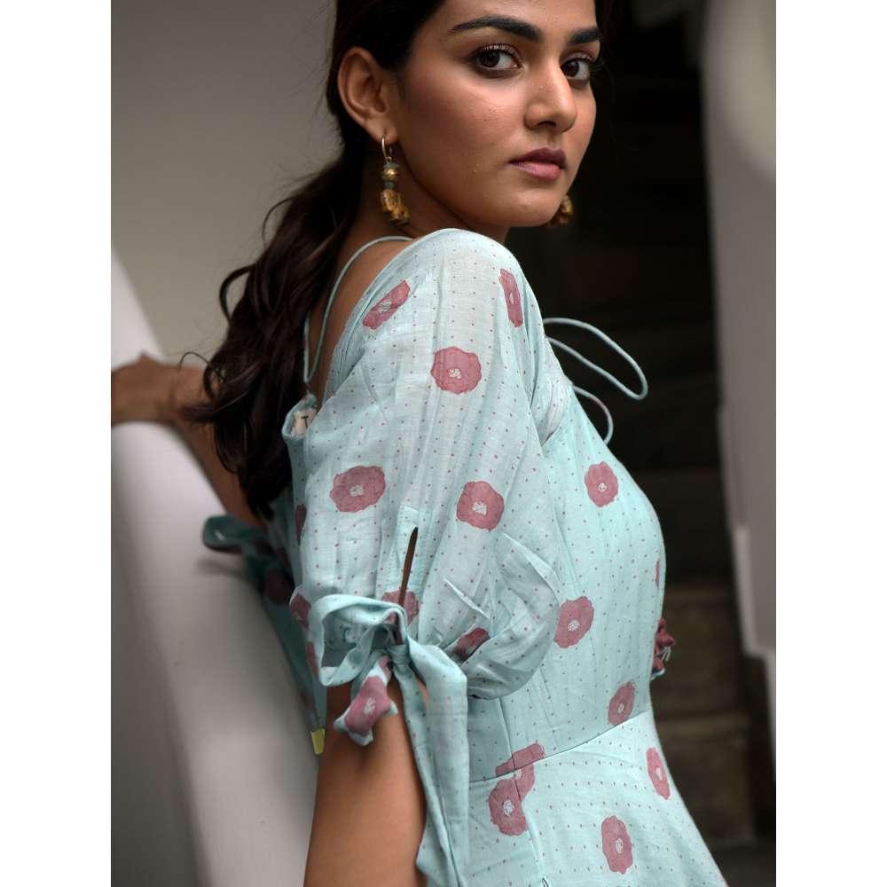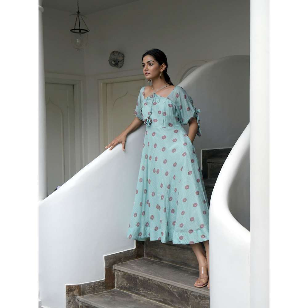 Description : Ocean Green bias cut dress with front tie up, Juliet sleeves & side pockets. Made of hand woven cotton silk in pastel shades of green with rustic peach poppy flower print. Ita s a bias cut dress with front tie up, Juliet sleeves, side pockets and hand crafted tassels.