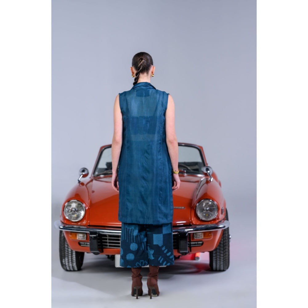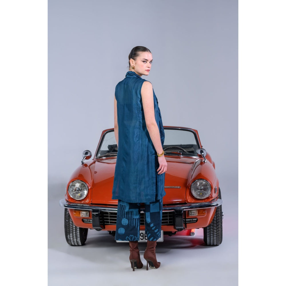 Description : Step Into Whimsical Allure Of The Tropics With Our Ensemble: An Ethereal Organza Over Jacket Adorned With Playful Denim Monstera Patches, Complemented By A Scalloped Bustier Exuding Feminine Charm. Paired Effortlessly With Teal Denim 1 pants Boasting A Captivating Printed Design, This Ensemble Effortlessly Merges Sophistication With A Touch Of Tropical Fantasy