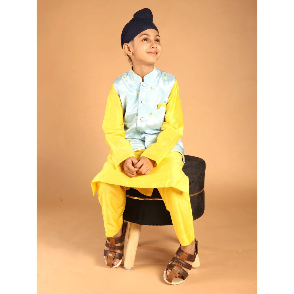 Description : Let your little one bloom in festive hues with our Phoolwar Kurta Set - featuring a soft blue embroidered Nehru jacket paired with a sunshine yellow kurta-pajama. Perfect for joyful celebrations and timeless family moments.