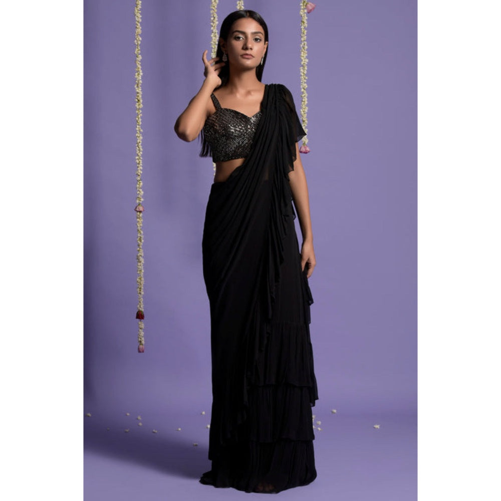 Featuring a black ruffled saree in georgette base. It is paired with a matching shimmer blouse having sequins embroidery.