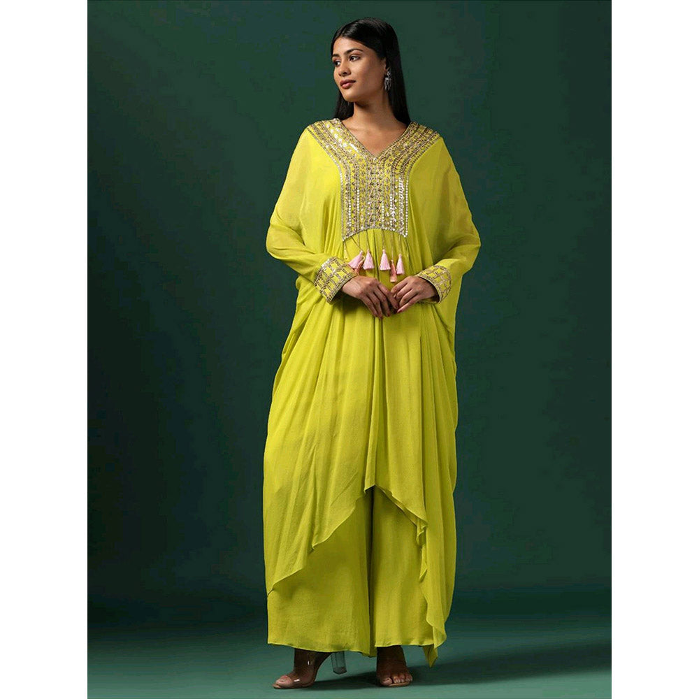 Description : Exude Grace In Our Green Georgette Kaftan, Embellished with Sequins and Tassels At The Neckline and Resham Detailing On The Sleeves. Paired with Matching Flared Pants, This Captivating Ensemble Is Ideal For Special Occasions, Ensuring You Leave A Lasting Impression.