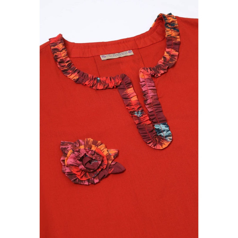 This Red Cotton Voile Kurta Features Exquisite Floral Printed Applique With Three Dimensional Rose Flowers Placed On Printed Appliqued Flowefit Slacks In Pure Cotton With A Side Strip Of Print Giving Them An Edgy Look.
