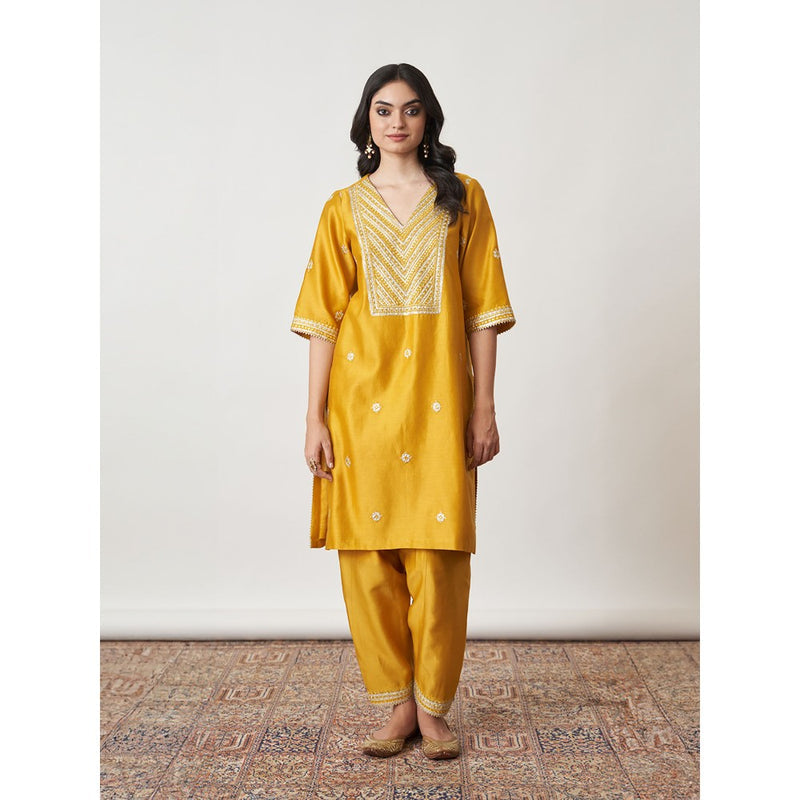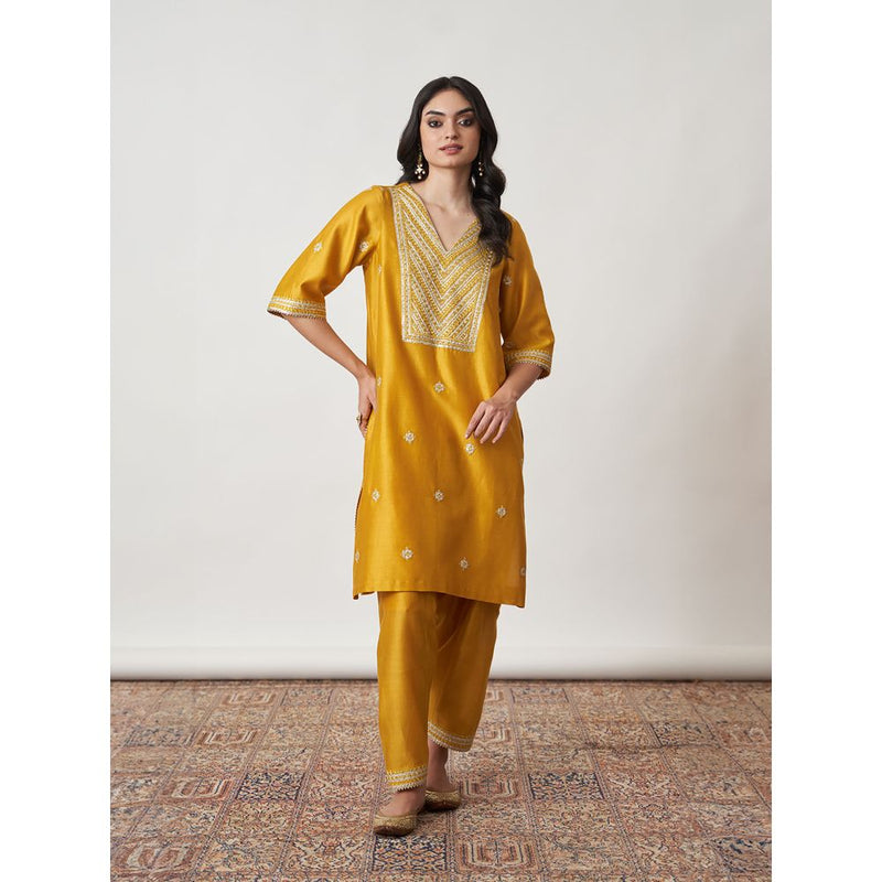 Vaaya The Sarson Silk Chanderi Ensemble Yellow Kurta with Pant and Dupatta (Set of 3)