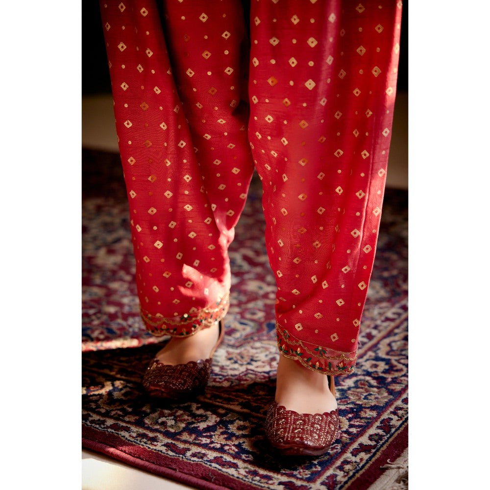 Red Silk Printed Short Kurta with Printed Salwar (Set of 2)