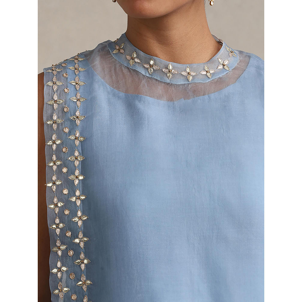 Description : Light Blue Hand Embroidered Pure Chanderi Gota Kurta With Asymmetric Cape And Pants Steal the show by wearing our Light Blue Hand Embroidered Pure Chanderi Gota Kurta with Asymmetric Cape and Pants on various special occasions. It is a standout piece from our Mughal-inspired "Mehrunisa" collection. This ensemble features a handloom Chanderi full-length, sleeveless Kurta paired with sleek, straight pants. The look is elevated by an asymmetric organza cape, intricately adorned with hand worked floral embroidery over the border and the neck. Pair this elegant light blue Kurta set with delicate pearl jewellery to fully embrace the festive spirit of Raksha Bandhan and Diwali. Color : Dress- Light Blue, Pants - Light Blue , Cape - Light Blue Technique - Hand Embroidery And Fabric: Dress - Chanderi, Pants - Chanderi , Cape - Organza *Note - Accessories shown are only for styling purposes and not part of the product. *Color Variance This product has been shot in studio lights and there may be a slight difference with actual colors. Delivery Time : 4 Weeks from date of placing the order. Made to order products are not eligible for exchange or return. The suits are available in standard size or can be made to measure, where we will tailor the outfit to your custom measurements taken over an email post receiving your order. For style or purchase related assistance please email us at: care@weaverstory.com / WhatsApp / Call us at 9810646345