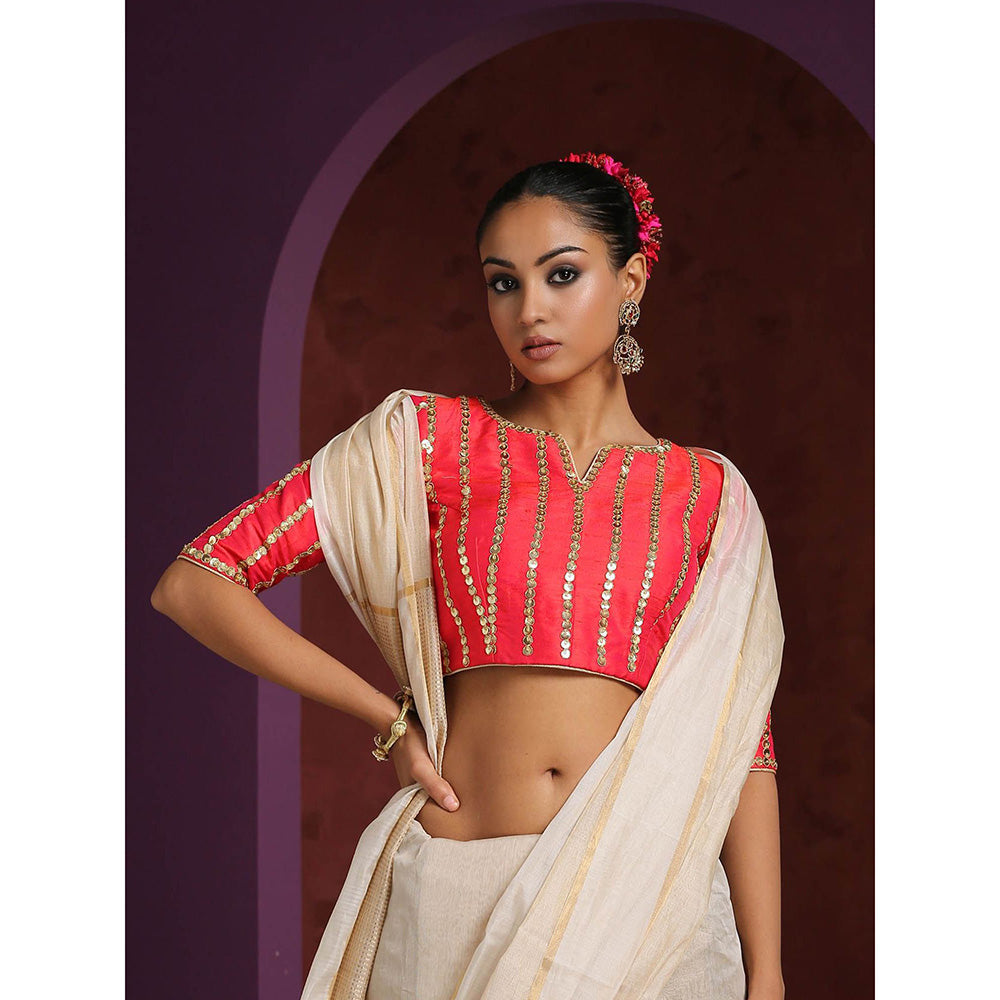 Description : An alluring red hand embellished blouse is a must have piece for wardrobe. Beautiful hand embellished is done on the base of raw silk fabric. The blouse has all over pattern done with sequin and dori work. Adorn this beautiful blouse along with elegant sarees and lehengas.