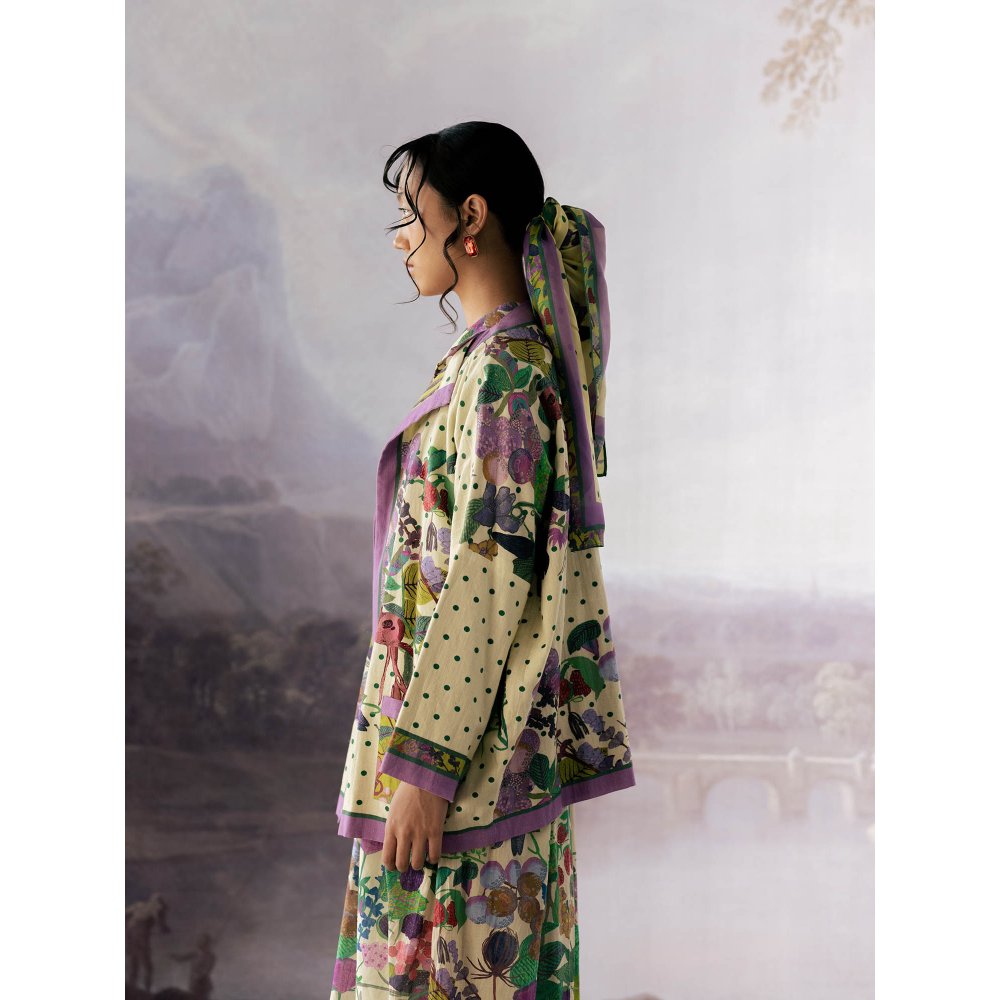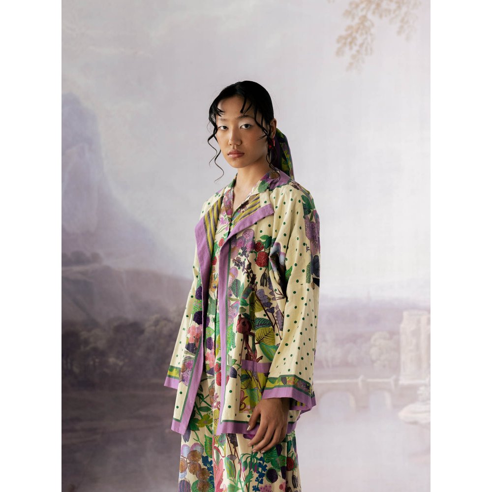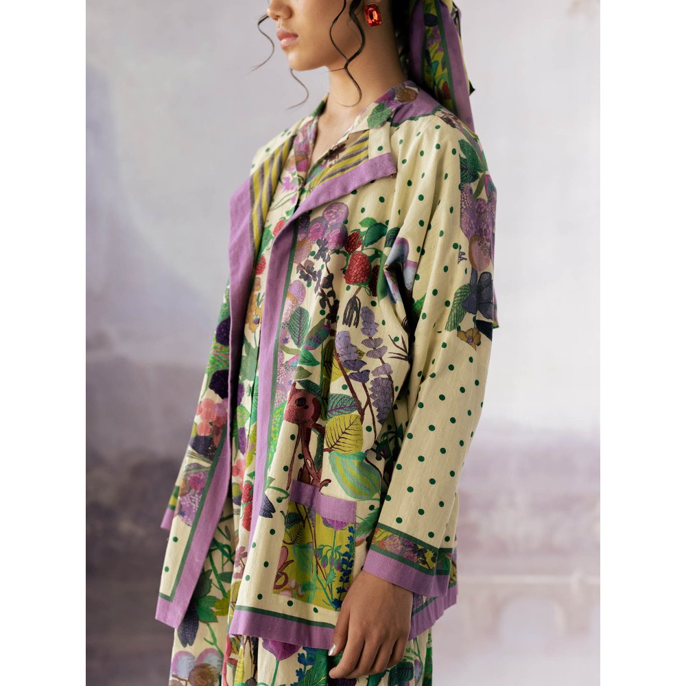 Description : Level up your look with this purple overlay from YAVI. Crafted from khadi in a comfortable fit, it is finished with full sleeves. Team it with a pair of jeans and sleek wedges.