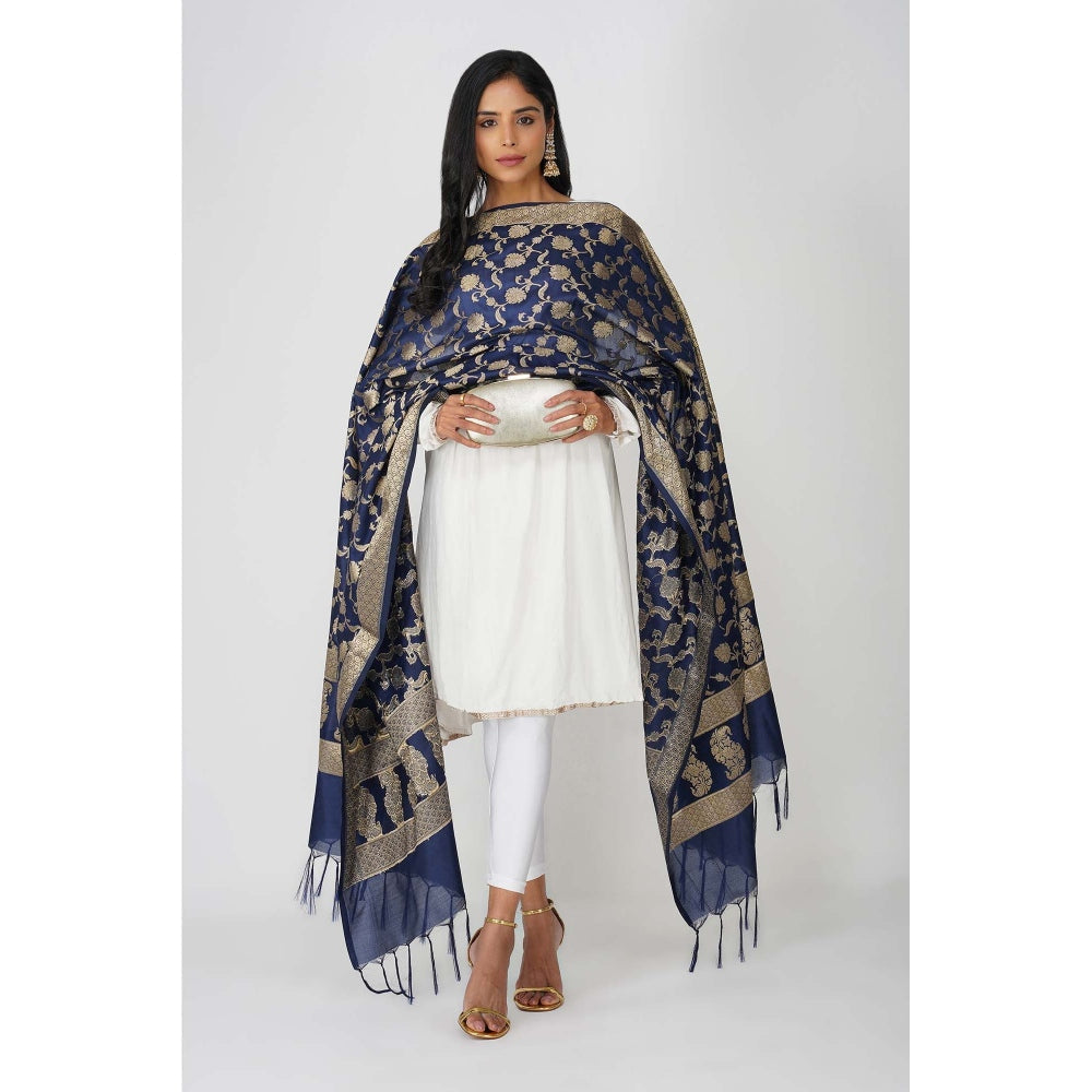 Zal from Benaras Dark Blue Pure Silk Banarasi Jangle Work Handloom Dupatta