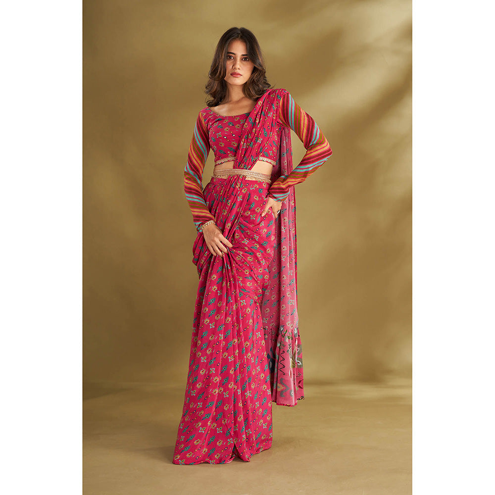 AFFROZ Pink Printed Pre-Drape Saree With Stitched Blouse And Belt with Stitched