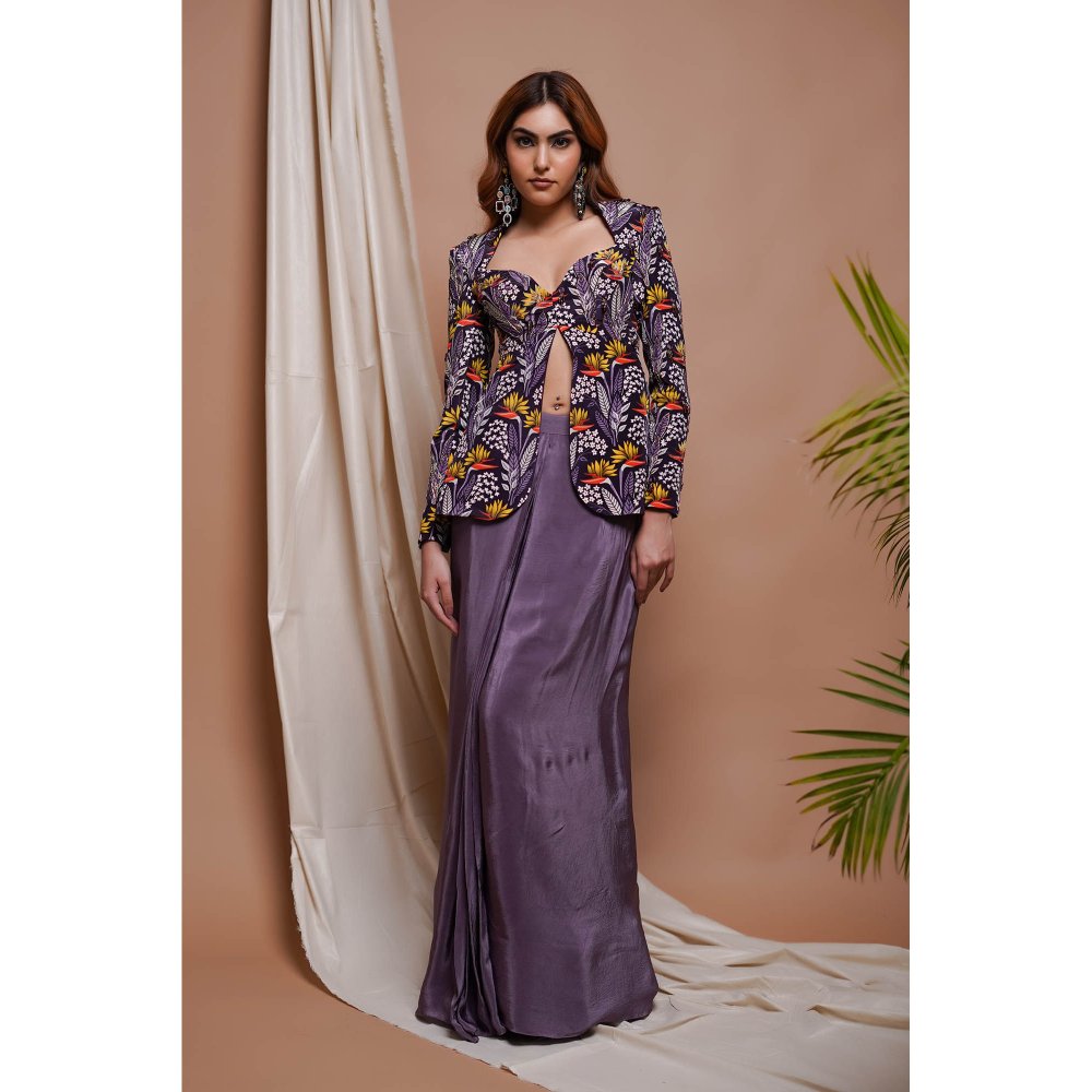 Purple Digital Printed Coat Style Top and Drape Skirt Set (Set of 2)