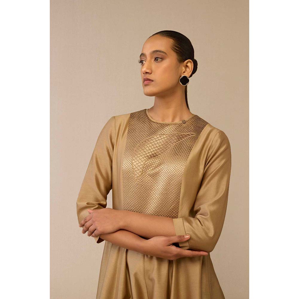 Description : A Symphony Of Subtle Details, The Dilana Kurta Set Is Made From Golden Beige Chanderi with A Soft, Luminous Sheen. The Kurta S Upper Bodice Features Intricate Quilted Embroidery, Where Delicate Bird and Cow Motifs Are Tucked Away Like Whispered Secrets. The Dupatta Mirrors This Artistry with Its Embroidered Border, While Flared Palazzos Complete The Ensemble with Effortless Grace. Ideal For Festive Evenings Or Intimate Celebrations, Pair Dilana with Our Ida Clutch and Golden Ninah Mules.