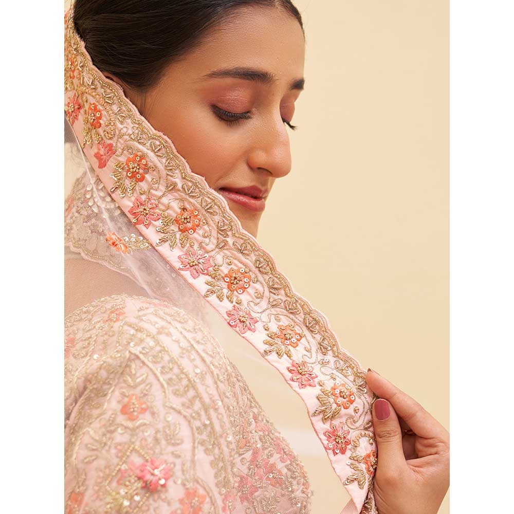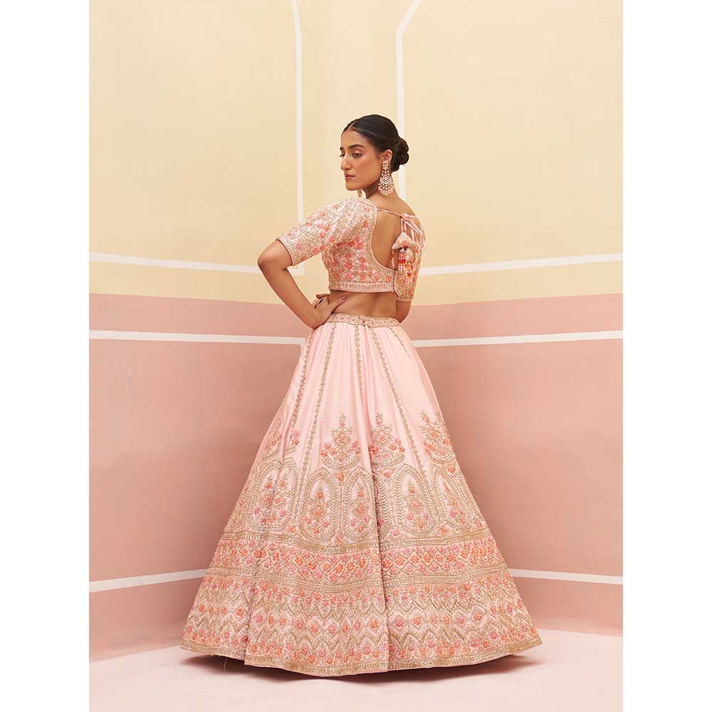 Description : Get your wedding look sorted with this pink lehenga choli from ANGAD SINGH. Crafted from raw silk and embroidered with traditional zardozi technique using silken threads, it is finished with half sleeves and a sweetheart neck. Complete the look with heels and statement jewellery.