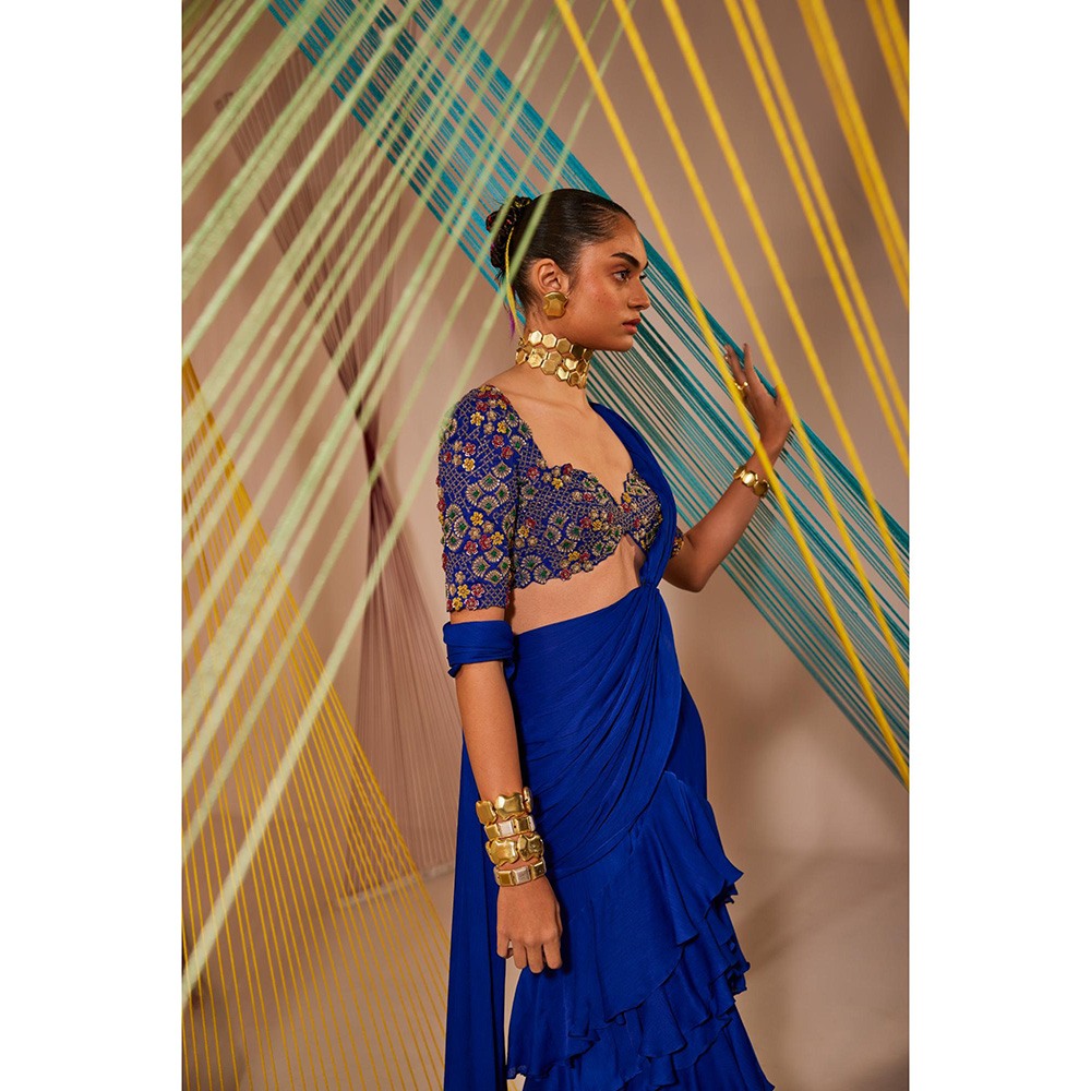Anu Pellakuru Blue Kiara Ruffled Pre Drape Saree with Stitched Blouse