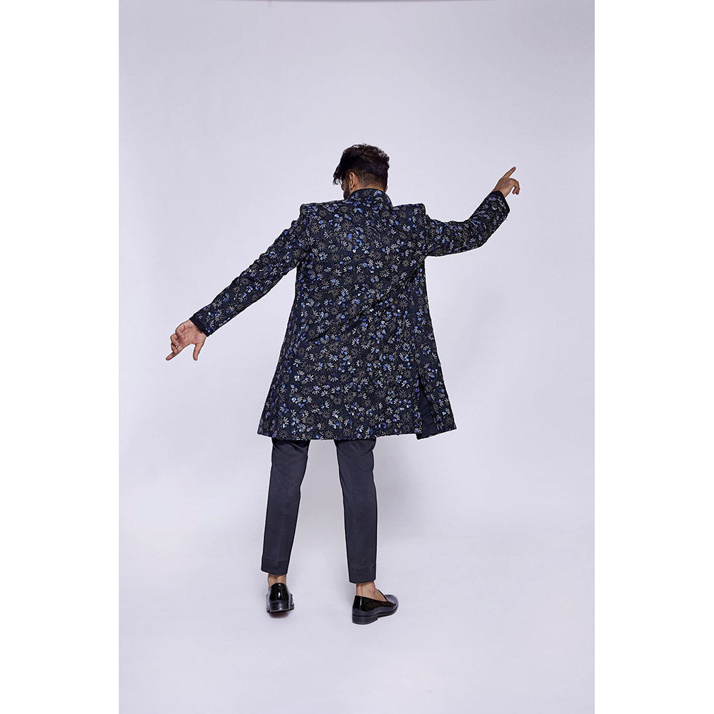Description : Black Salli Cut Dana Embroidered Open Sherwani. Tailored to sartorial perfection from premium quality fabric, it assures a soft and soothing touch against the skin. The exquisite silhouette adds to its appeal.