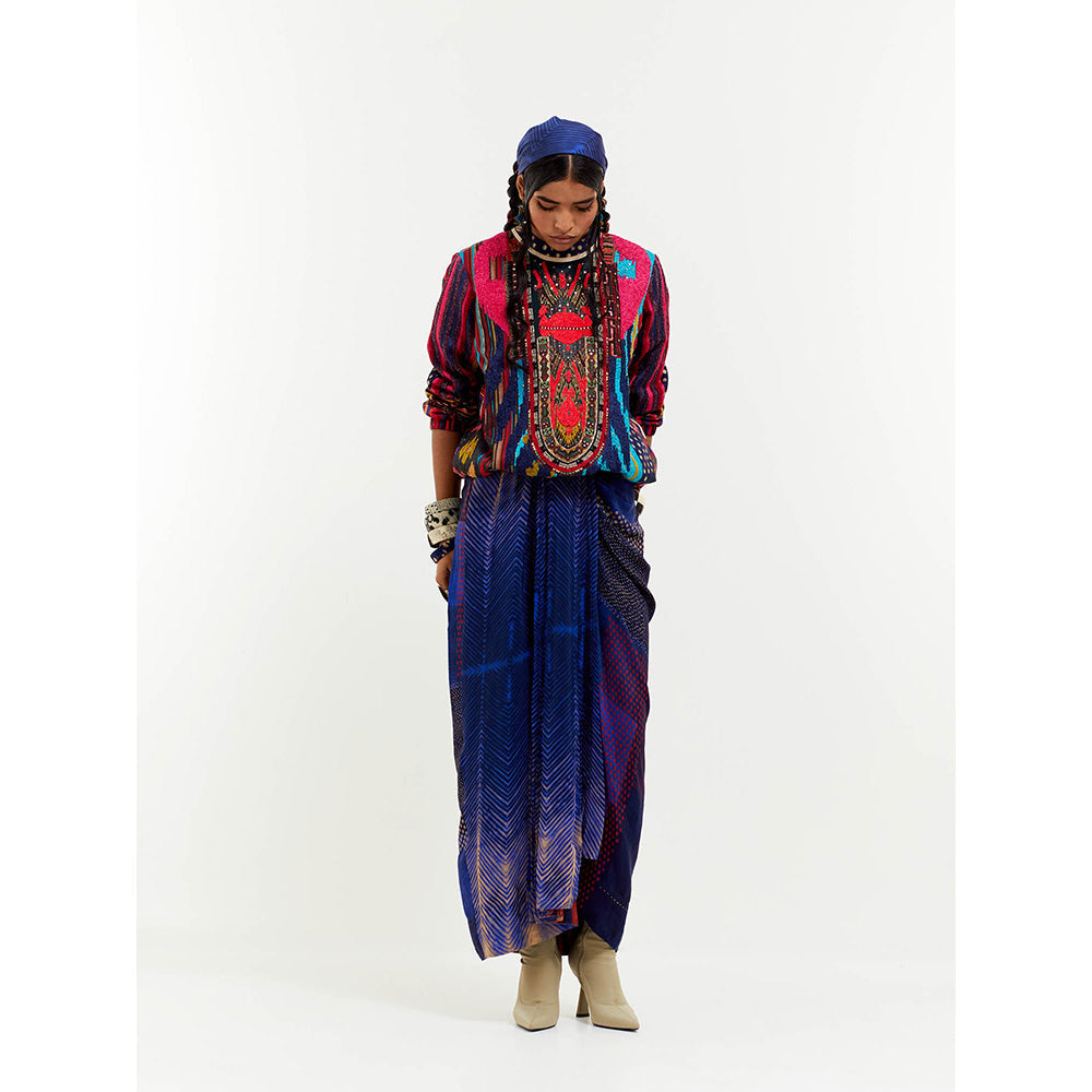 Description : Printed And Embroidered Top With Metal Zip Opening At The Back & Shibori Print Pleated Skirt.