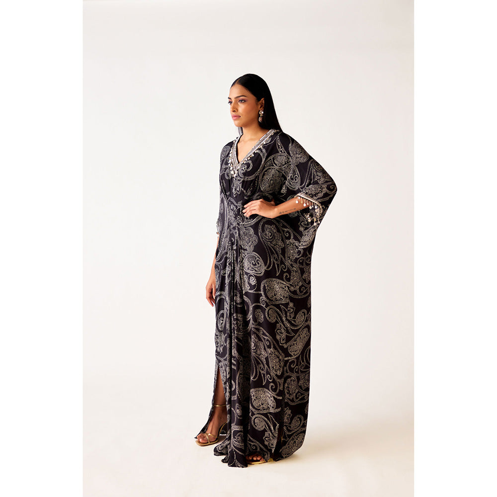 Description : Make a style statement with this black kaftan from Basanti Kapde aur Koffee. Crafted from crepe, this beautiful kaftan is finished with flared sleeves and a v-neck. Complete the look with a pair of trousers, heels and minimal jewellery.