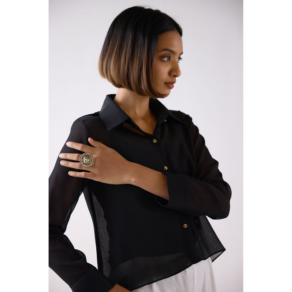Description : Adorn The Chic With This Black Shirt From Basanti Kapde Aur Koffee. Made From High Quality Chiffon, It Features Button Fly Closure And Textured Pattern Along With Full Sleeves & Collar Neck Design. Pair It With Minimal Jewellery And Trendy Footwear To Complete Your Ensemble.