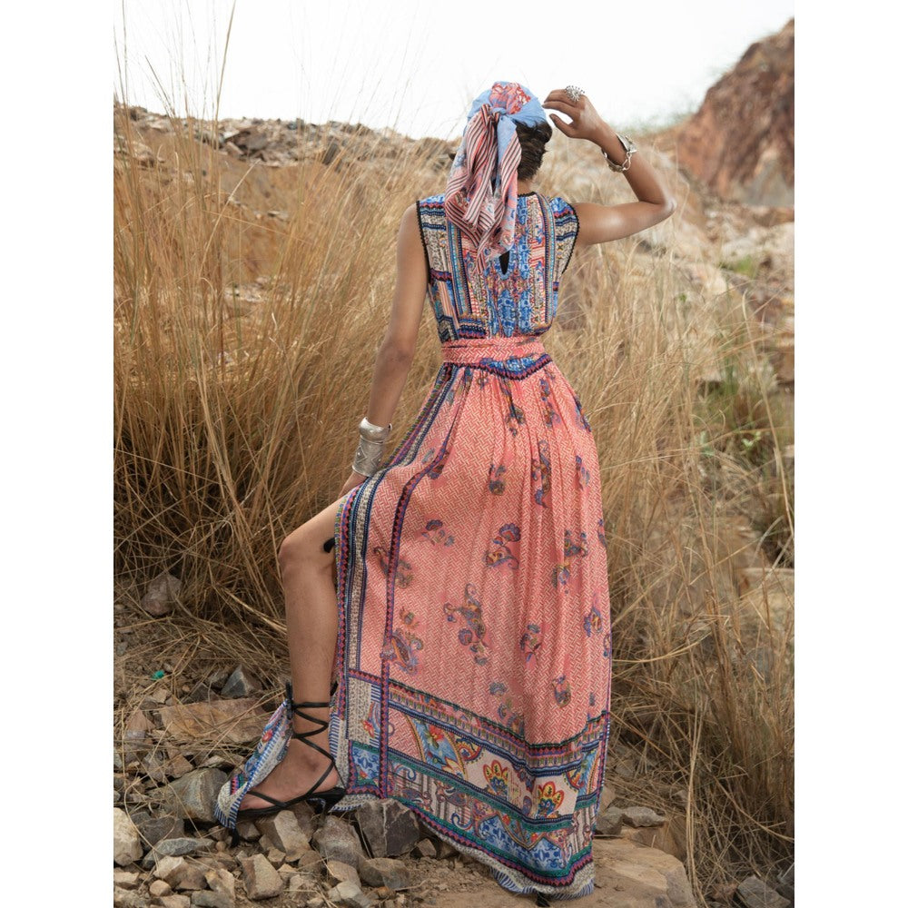 Bhanuni by Jyoti Pastel Cornflower Rouge Pink Maxi Dress with Belt (Set of 2)