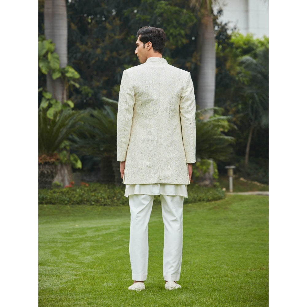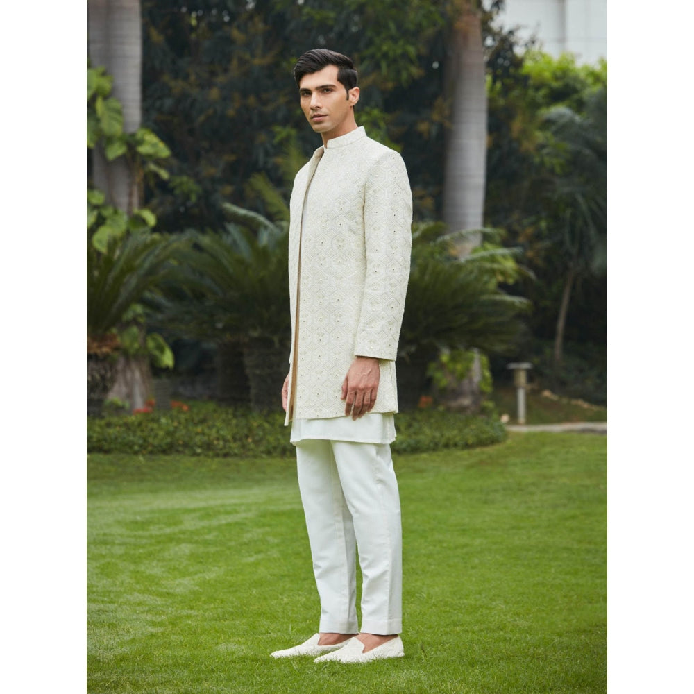 Description : Keep your fashion game strong with our Itvara Open Achkan Kurta Set > Achkan Kurta Fabric: Georgette Chikankari> Kurta Fabric- Cotton Silk Tassar> Pant Fabric- Cotton Silk Tassar> Technique Used- Chikankari> Color- Off White> Full Sleeves> Fit- Slim Fit> Set of 3- Kurta, Kurta, Pants> Please Note: Embroidered Kurta Fabric Shoes/Jutti's can be added, kindly contact for customisation> Please Note: Sizes above XXL, kindly contact for customisation> The model (height is 6 ft) is wearing a size M> Care Instruction - Dry Clean Only> Custom cut, sewn, and packed in New Delhi> Please note that the shoot of the product has been done professionally so sometimes the colors on screen appear brighter. Due to the Lighting during Photo Shooting or the Monitor's Display.> Delivery time: 3 weeks