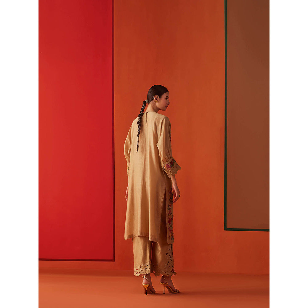 Beige Chanderi Floral Embroidered Kurta with Pant (Set of 2)