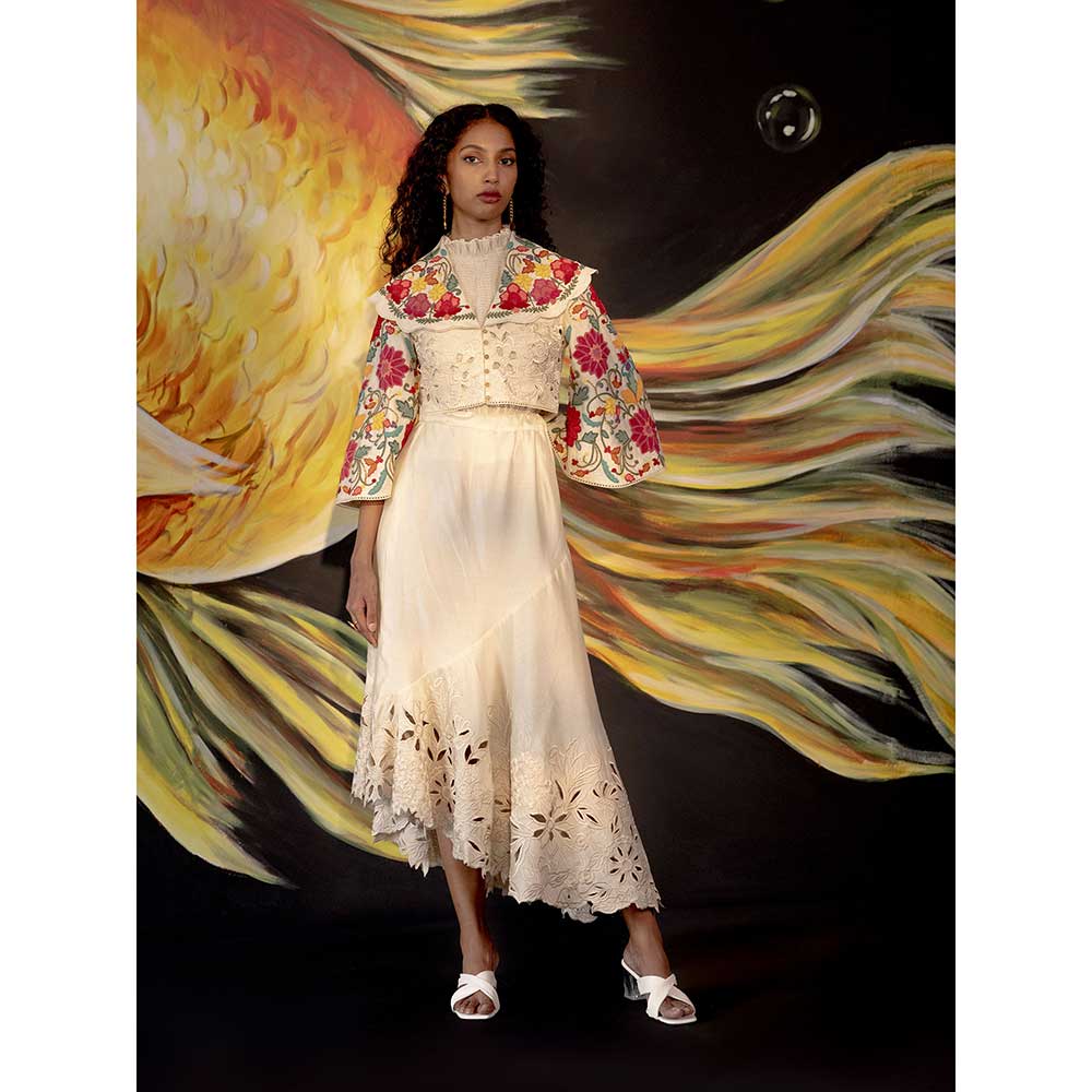 CHANDRIMA Ivory Cutwork Bolero Jacket with Bell Sleeves