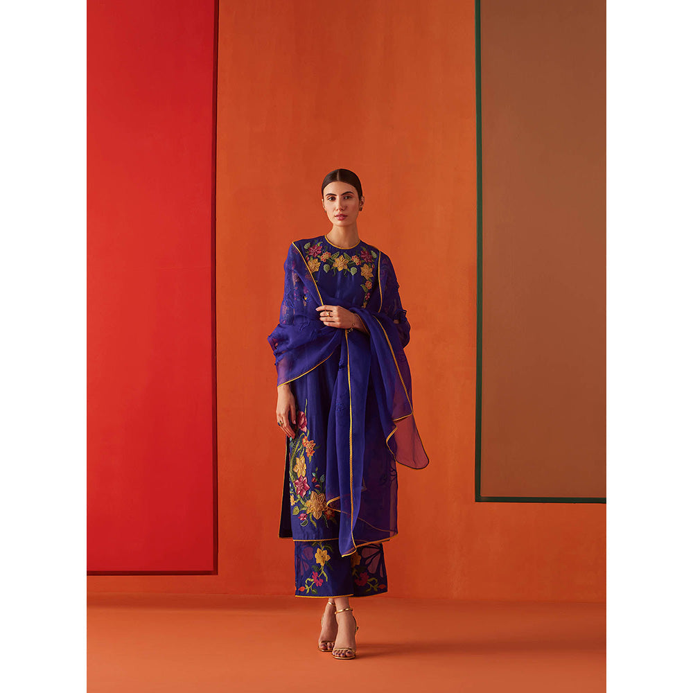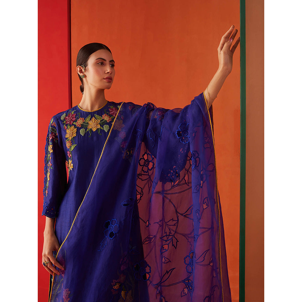 CHANDRIMA Navy Blue Organza Floral Embroidered Dupatta