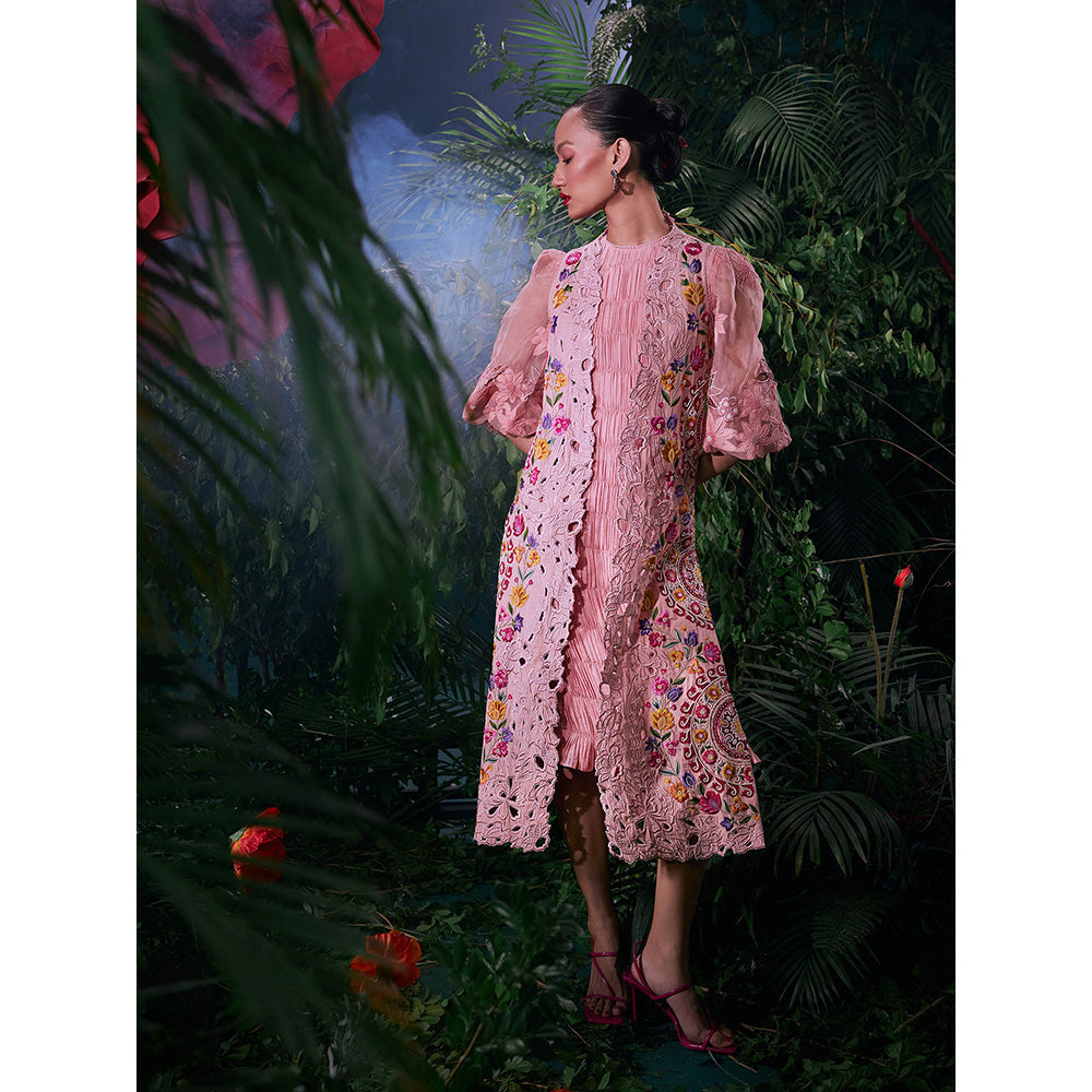 Description : Infuse fashion-forward elegance with this pink midi dress from CHANDRIMA. Made from high-quality fabric, this midi dress features balloon sleeve and a crew neck, with a embroidered pattern. Style it with a minimal jewellery and sandals to complete the ensemble.