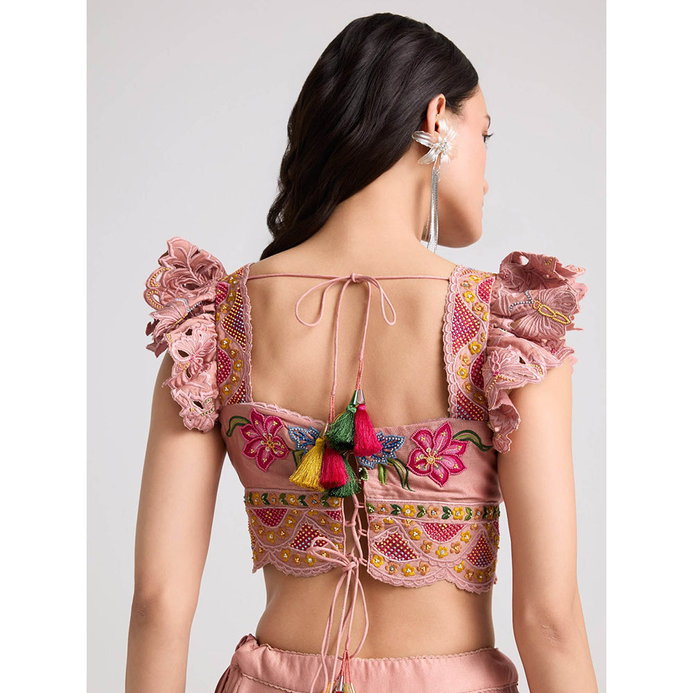 Description : Soft Pink Chanderi Multicolor Floral Threadwork And Beadwork Crop Top.