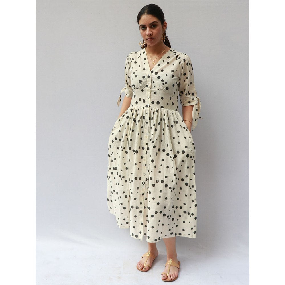 Description : Embrace the latest fashion trends by owning this ivory dress from Chidiyaa. Tailored from cotton, it features a V-neck, front closure, and is enhanced with a normal fit. Complete it with a pair of flat heels for an elegant look.