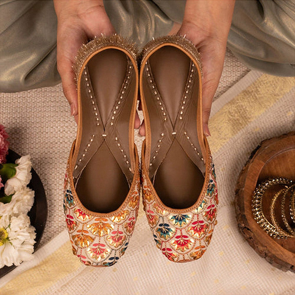 Description : Elevate your outfit with these multi-color juttis from Coral Haze. Crafted from dupion with rubber sole, this stylish pair offers both comfort and durability.
