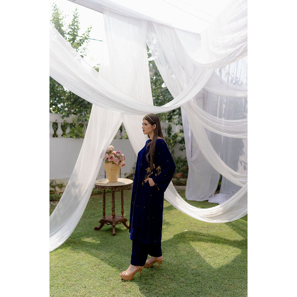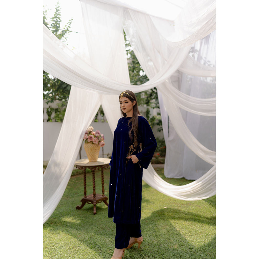 Royal Blue Velvet Peacock Pocket Kurta (Set of 2)
