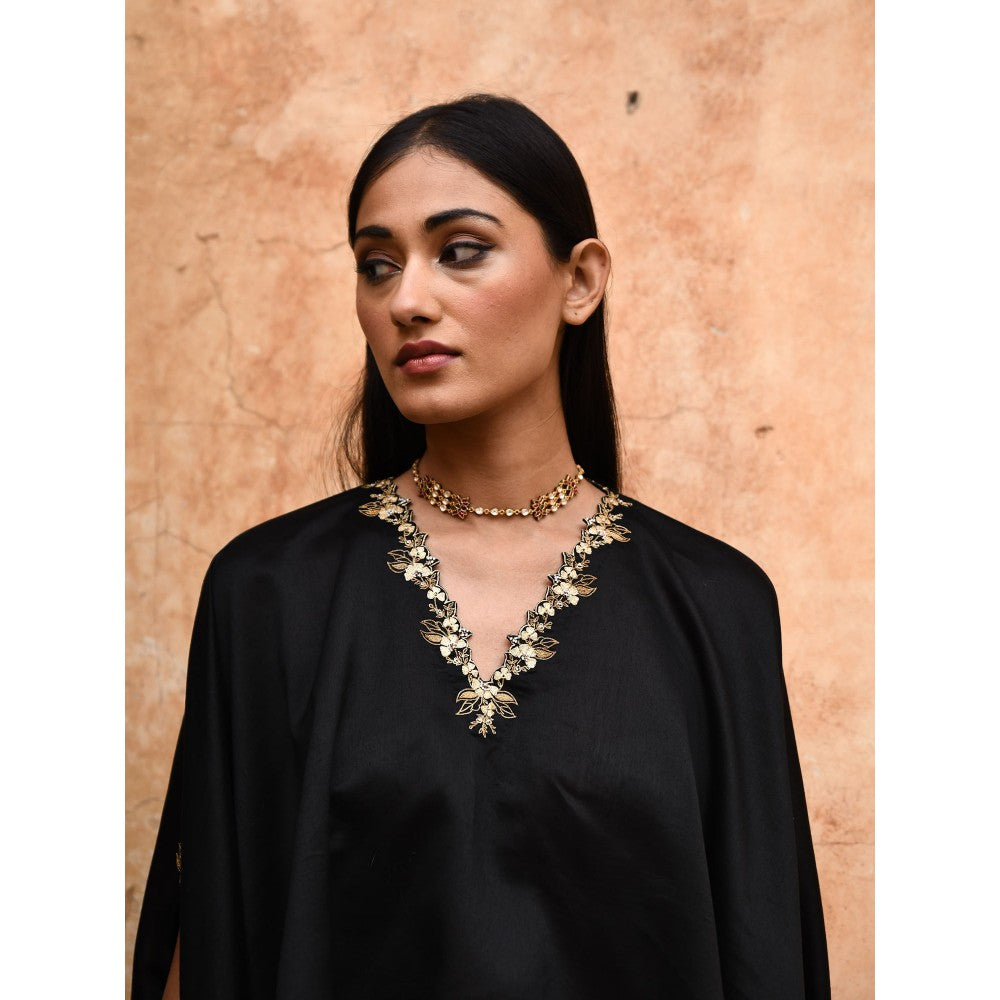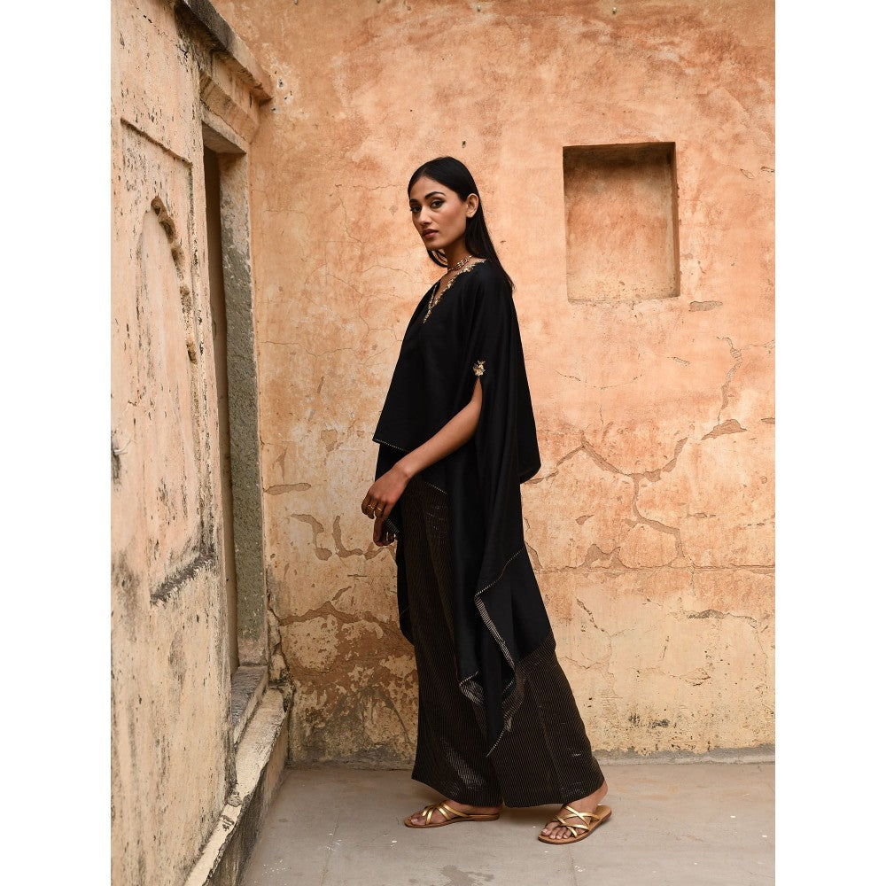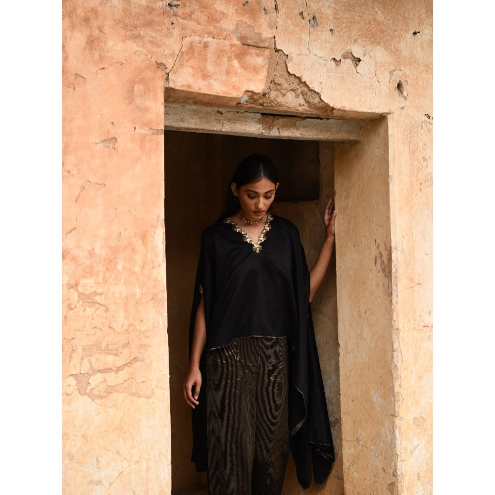 Description : Black Phool Guccha Embroidered Neckline Dupatta Style Cape. It Is Paired With Tissue Striped Pants