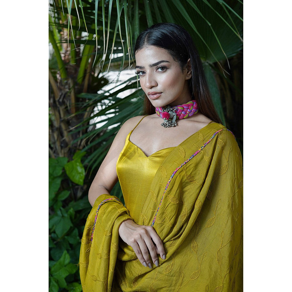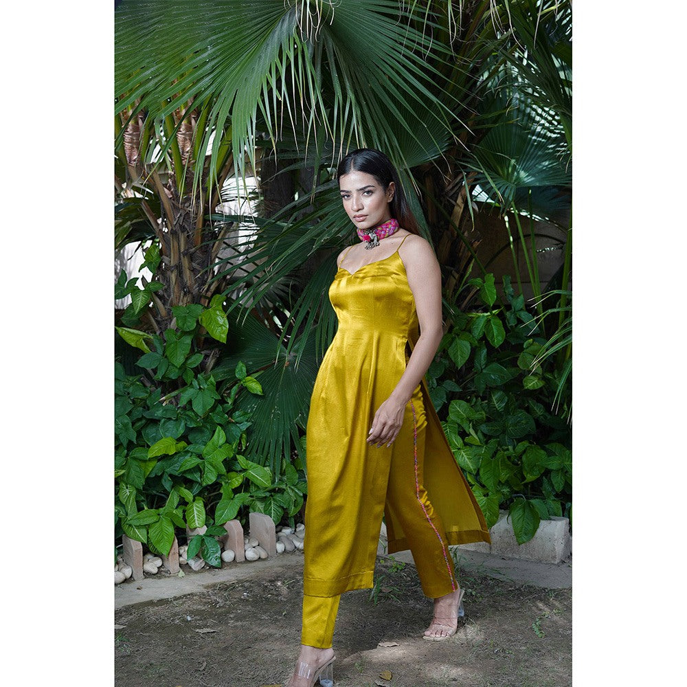 Description : Sunheri mustard yellow handmade mashru silk adjustable spaghetti strap kurta set with sweetheart neckline and high slits on both the sides . Paired with same color of pants . The pants features a multicolored lace embellishment along the length add a contrasting festive look to the set and are elasticated at the back. There are side slit pockets with pants for your comfort . The dupatta features an all over thread embroidery in the same color and same embellishments as the pants . Pair with gold earings, clutch and a pair of heels to complete the look and stand out this festive season .