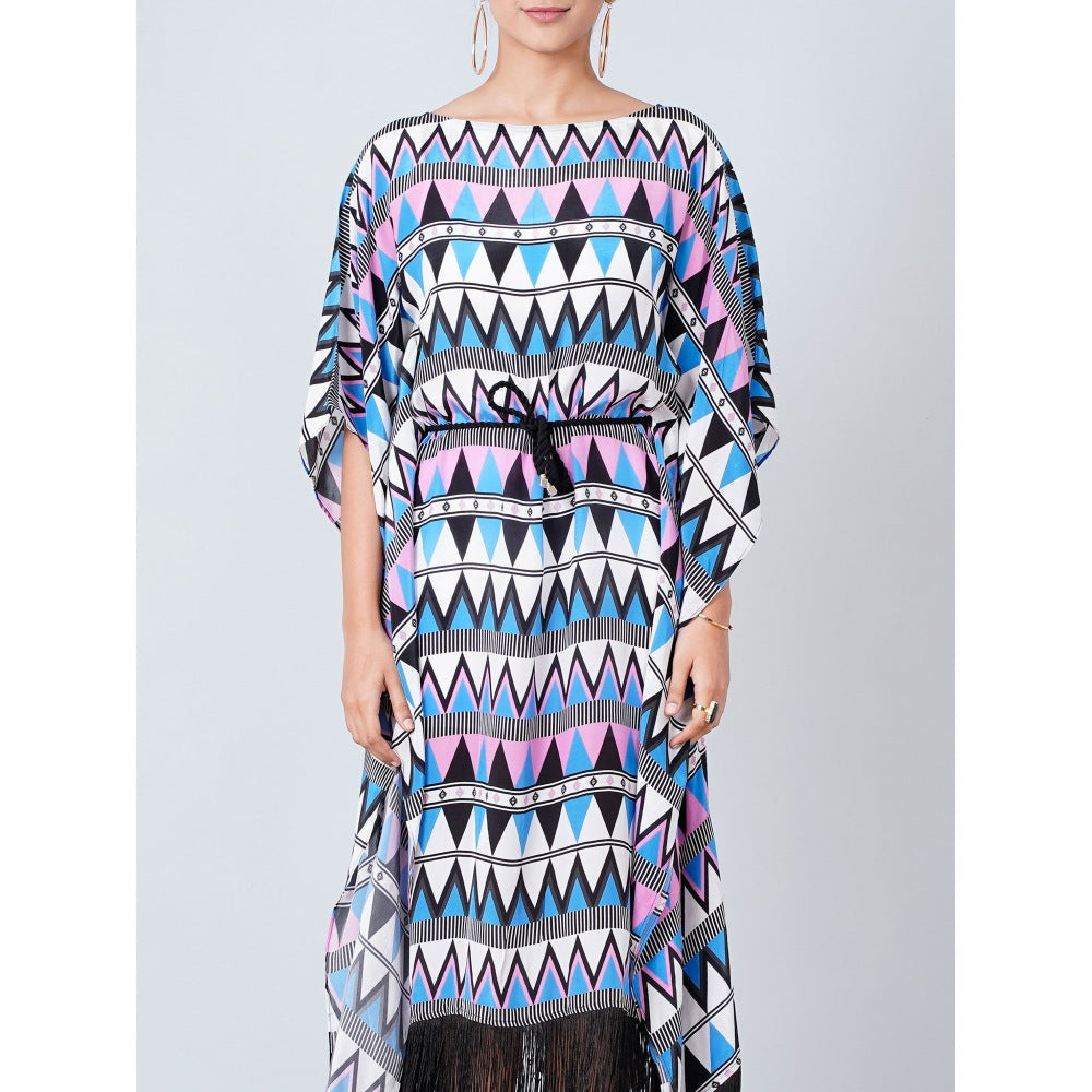 Description : Geometric prints are must haves. Update your wardrobe with this blue and pink Aztec poncho dress which comes with a braided belt for a perfect fit. This gorgeous looking piece from First Resort by Ramola Bachchan is crafted from viscose material, that features a pull on closure and a beautiful pattern which enhances your overall look. Style it with a pair of jute flats and tote bag to complete the look.