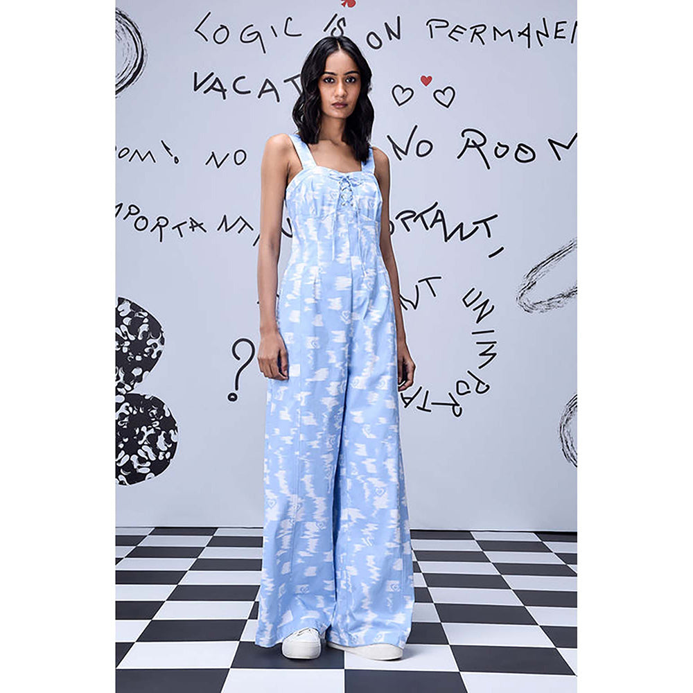 Genes Lecoanet Hemant Blue Cotton Square Neck Abstract Jumpsuits