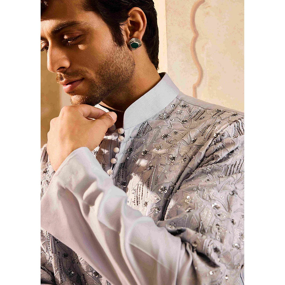 Chanderi Men Blue Embroidered Kurta with Trouser