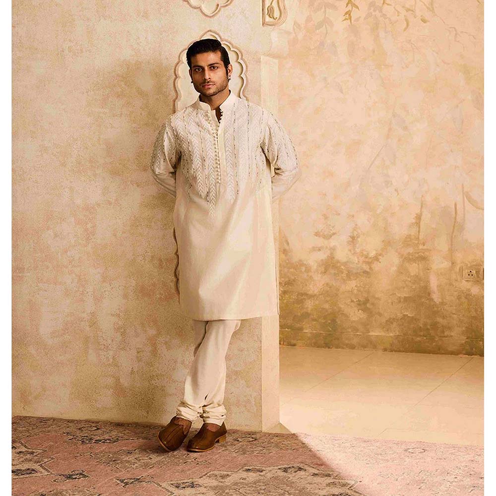 Chanderi Men Ivory Embroidered Kurta with Churidar
