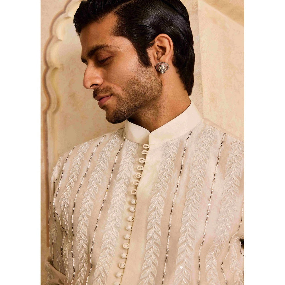 HISTORI Chanderi Men Ivory Embroidered Kurta with Churidar