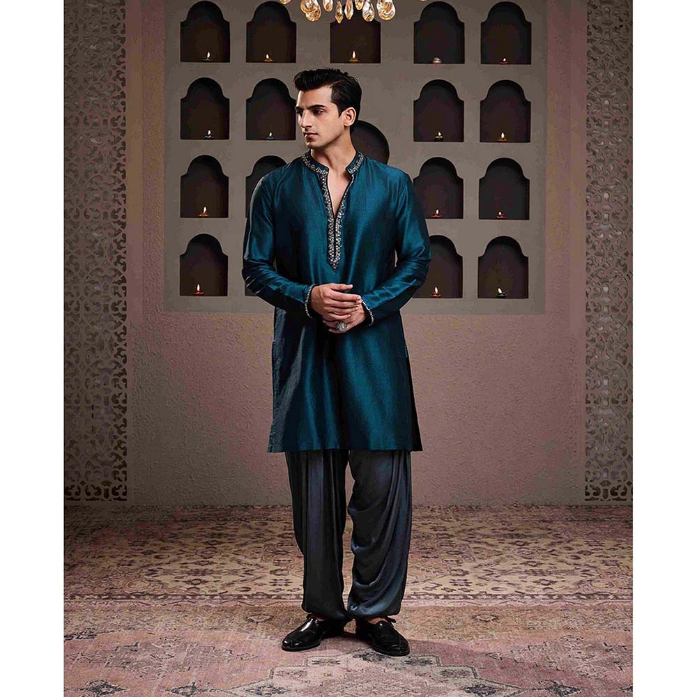 Chanderi Men Teal Embellished Kurta with Salwar