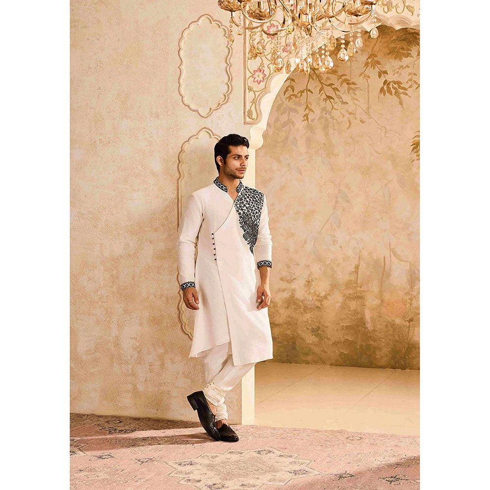 Description : White Chanderi Ang Rakha Kurta with Asymmetrical Hemline Embroidered with Black Resham Embroidery Work Embellished with Beads and Cut dana Paired with a Churidar.