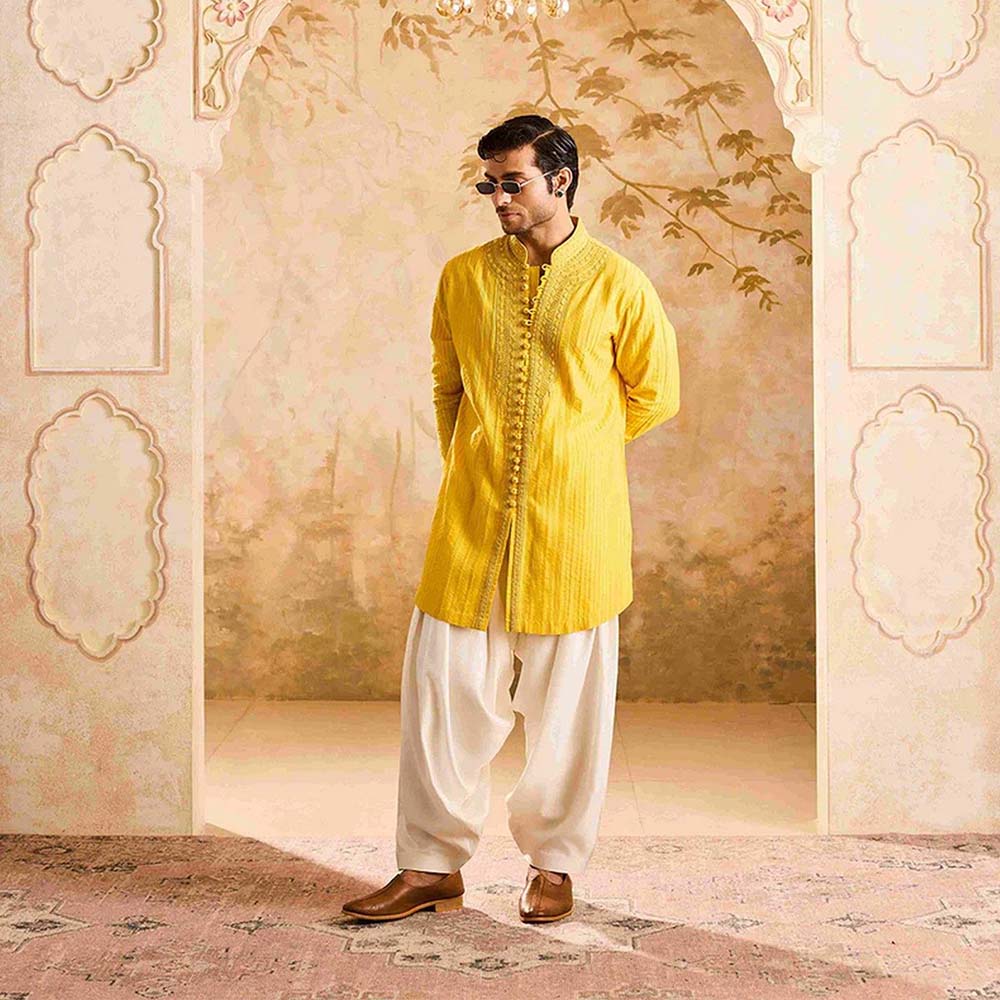 HISTORI Chanderi Men Yellow Embroidered Kurta with Salwar