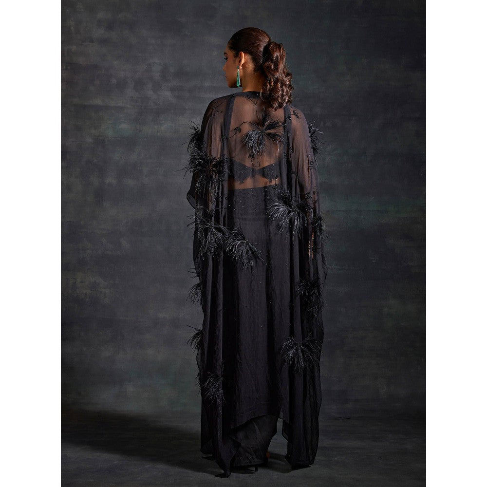Description : Blouse-solid black blouse , Skirt-waist band drape skirt and Cape-feather cape. Tailored to sartorial perfection from premium quality fabric, it assures a soft and soothing touch against the skin. The exquisite silhouette adds to its appeal.