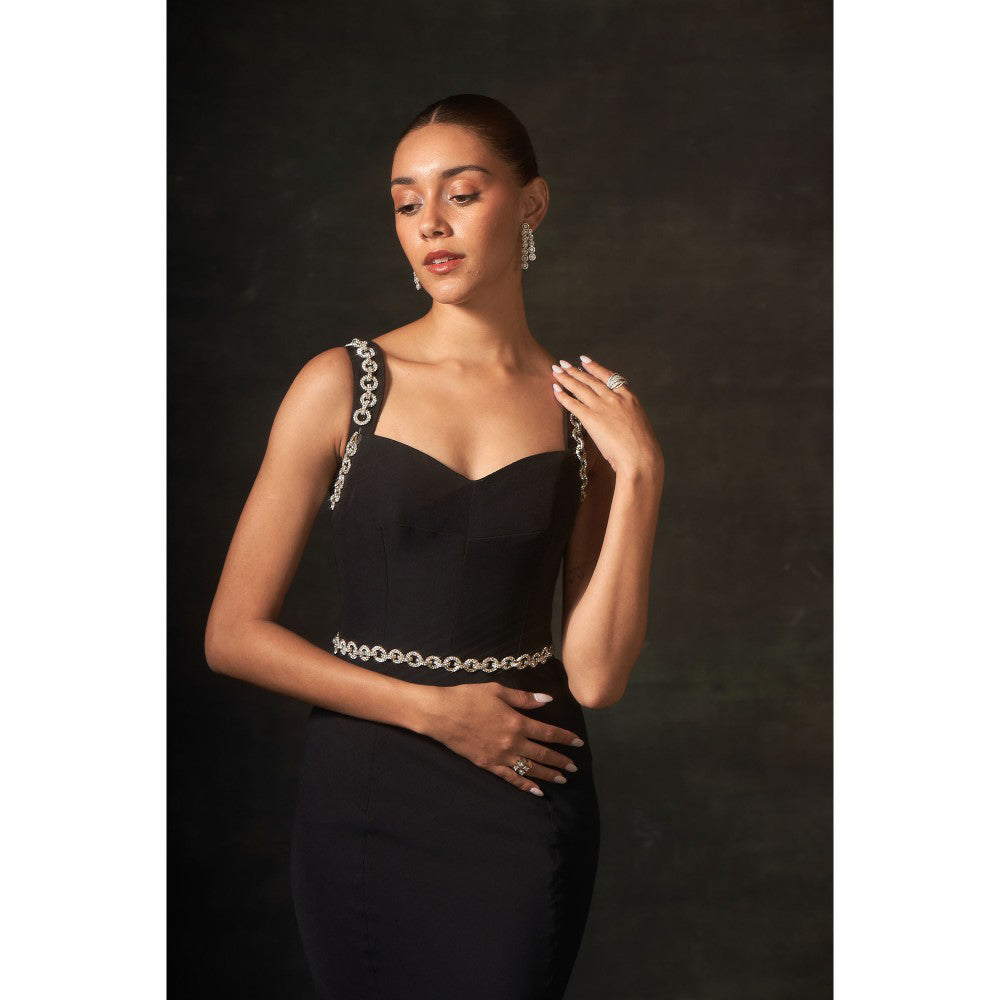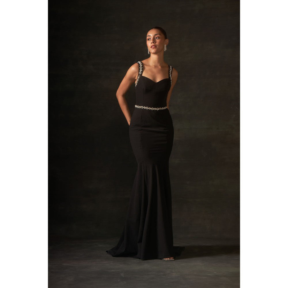 Description : Add a touch of spice to your wardrobe with this black maxi dress from House of Exotique. Made from high-quality crepe, this dress features a sleeveless design, a sweetheart, zipper closure, and a sequined pattern. Style it with minimal jewellery and heels to complete the ensemble.