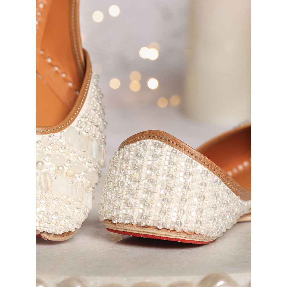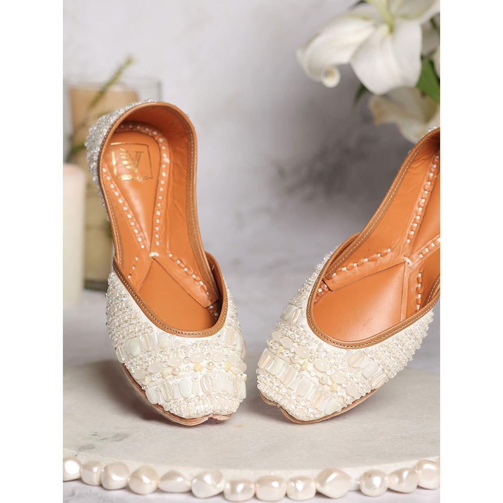 Description : Step into style with Nooriya Juttis - elegant white juttis adorned with 10 different white stones and beads. Perfect for any occasion, these embellished shoes add a touch of glamour to your look. Be the envy of everyone with these stunning juttis!